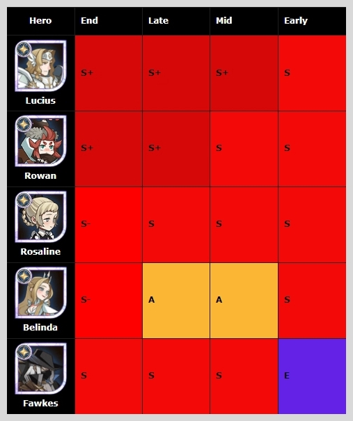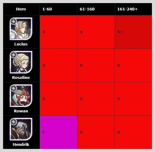 루시우스와 로완 로젤린 모두 게임 전체 레벨에서 S로 좋은 평가를 받는 레오프론 영웅입니다. 벨린다는 초반과 후반에만 좋은 평가를 받아서 조금 아쉬운 점이 있네요.