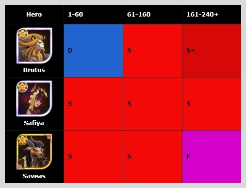 사피아는 꾸준히 안정적으로 S로 평가받고 있고요. 세이비스는 초반에 많이 사용되는 딜러이지만 후반에 가서는 F로 나중에는 잘 사용되지 않는 영웅입니다.