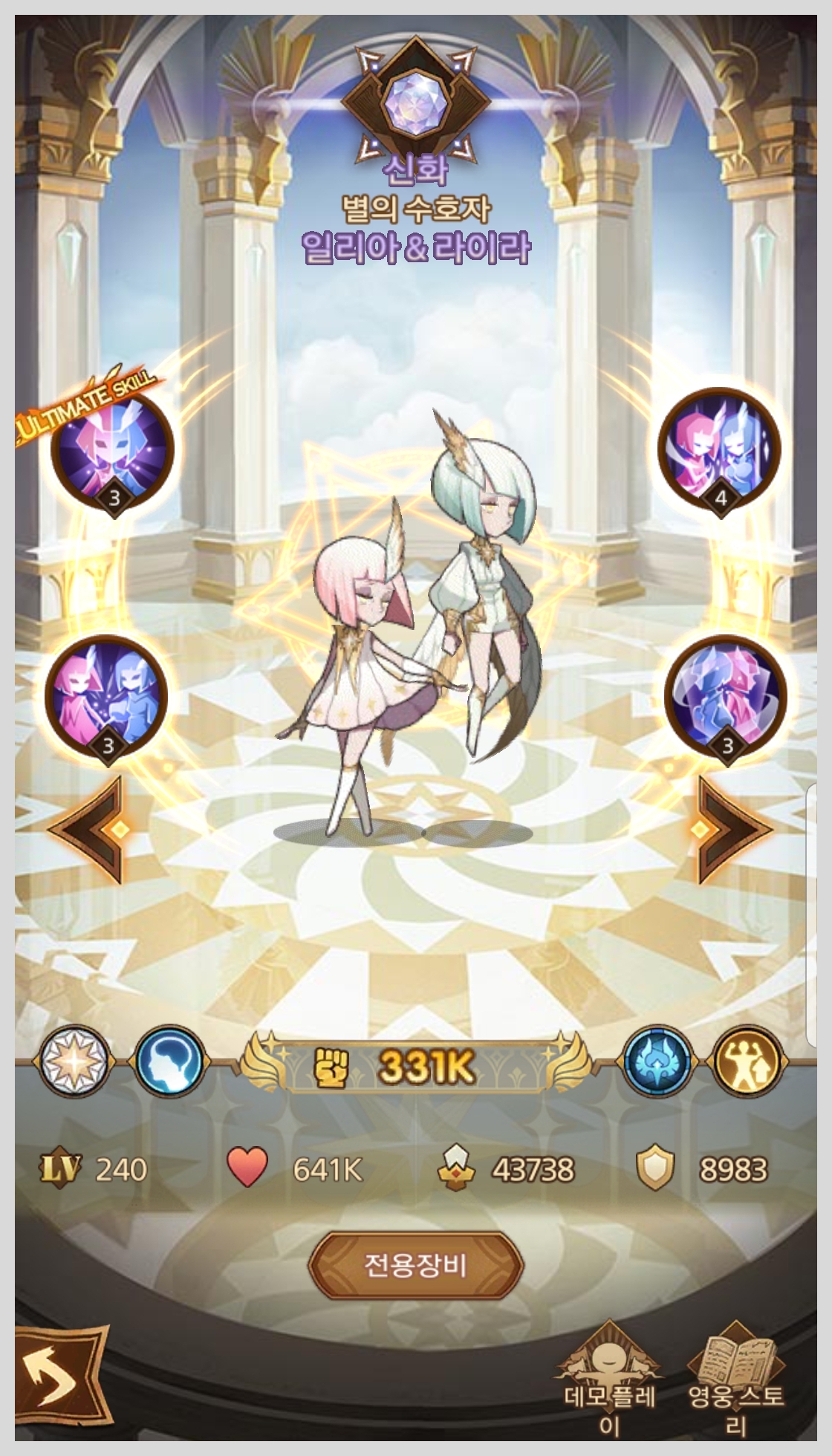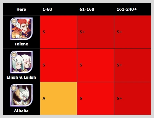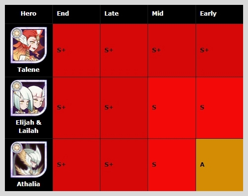 탈렌은 봉황이라 지속적인 부활이 가능해서 시간의 정원에서 지원군으로 있으면 아주 든든하게 클리어할 수 있습니다. 일리아&라이라 또한 전체적으로 레벨S로 좋은 평가를 받는 반신 영웅입니다.