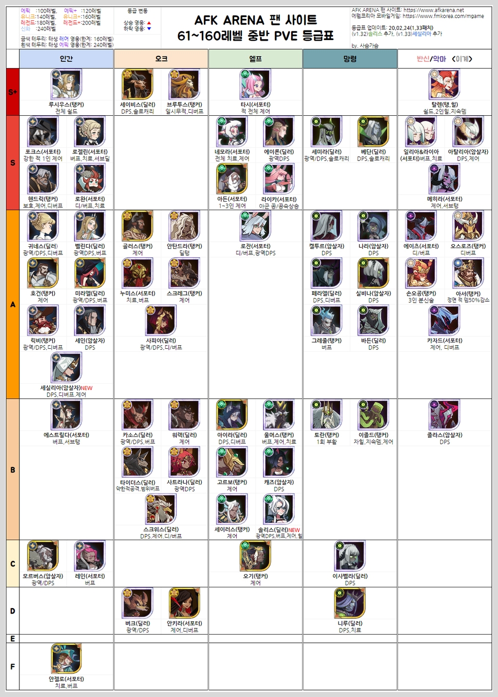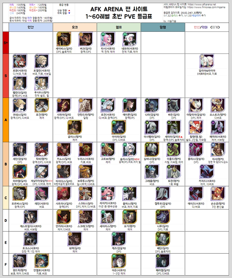 요즘 즐겨하는 afk아레나 등급표를 준비해보았습니다. 매번 월계수 주점에서 영웅 캐릭터 소환 후에 새로운 영웅이 나오면 등급표 찾는 게 번거로워서 직접 모은 자료로 정리해서 올려봅니다.