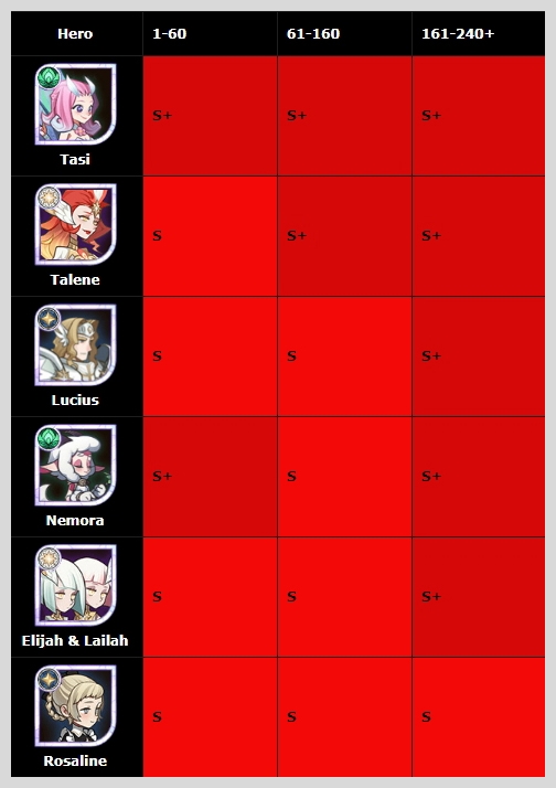 제가 이제 막 중반에 들어섰는데요. 중반부터는 괜찮은 영웅을 진급시켜서 최대 레벨을 얼마나 빨리 올리느냐가 관건인 것 같습니다. 등급표에서는 탱커는 루시우스나 브루투스, 딜러는 세이비스나 세미라, 서포터로는 타시가 S+에 올라 있네요. 탈렌은 탱커와 힐러로서 좋은데 소환하기가 어려운 것 같습니다. 저도 아직 만나보지 못한 영웅이라 많이 궁금하기도 합니다.