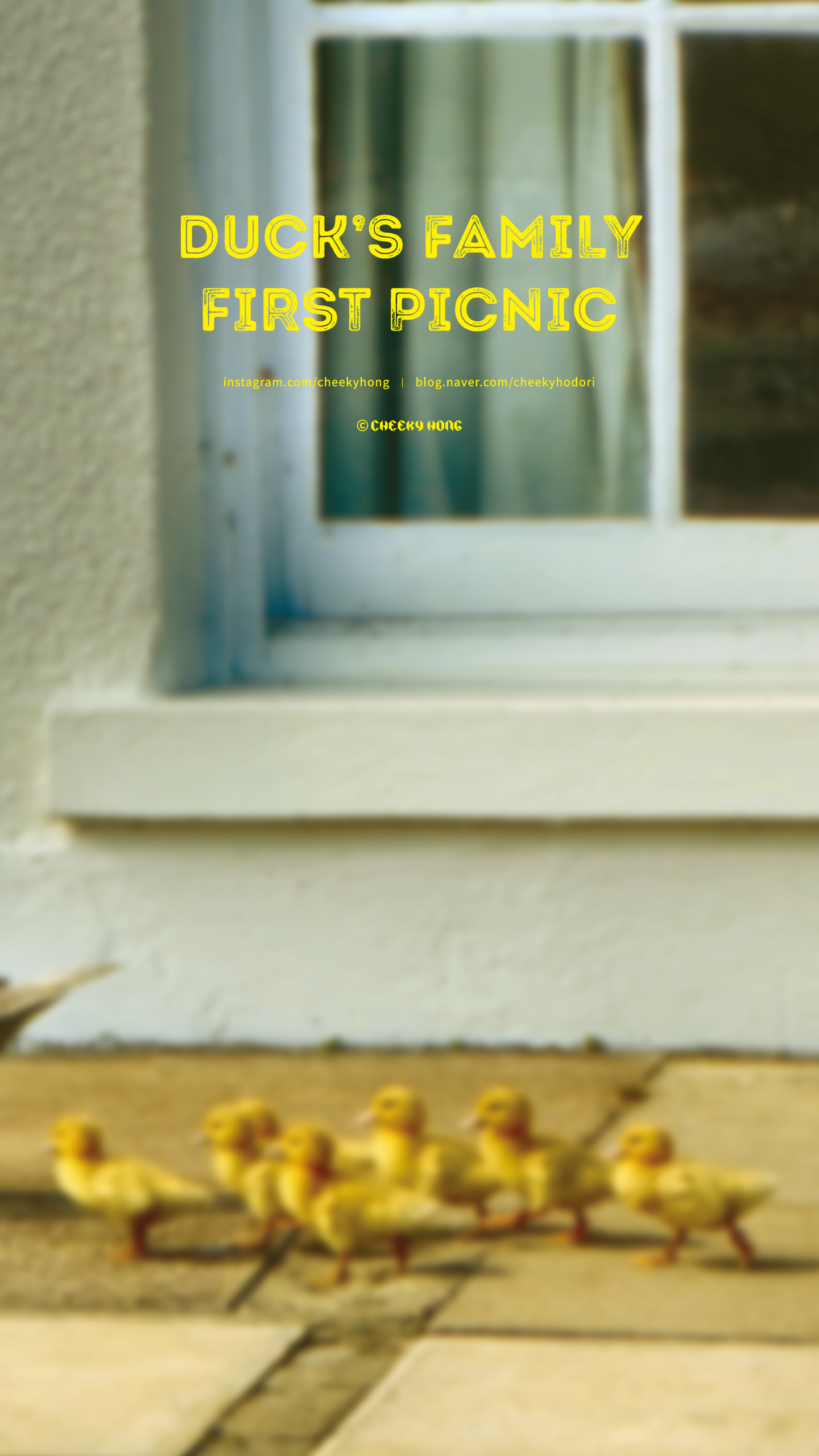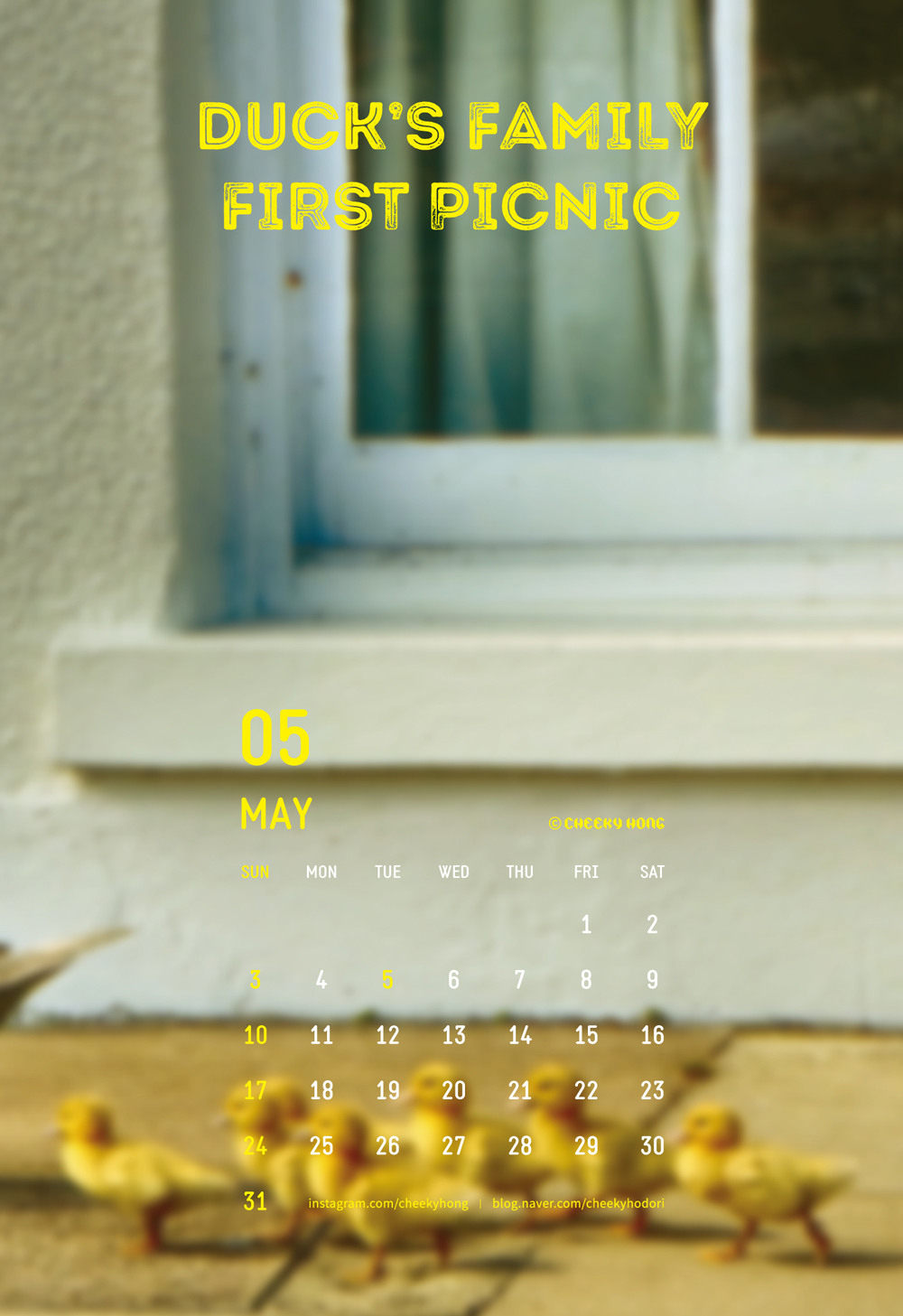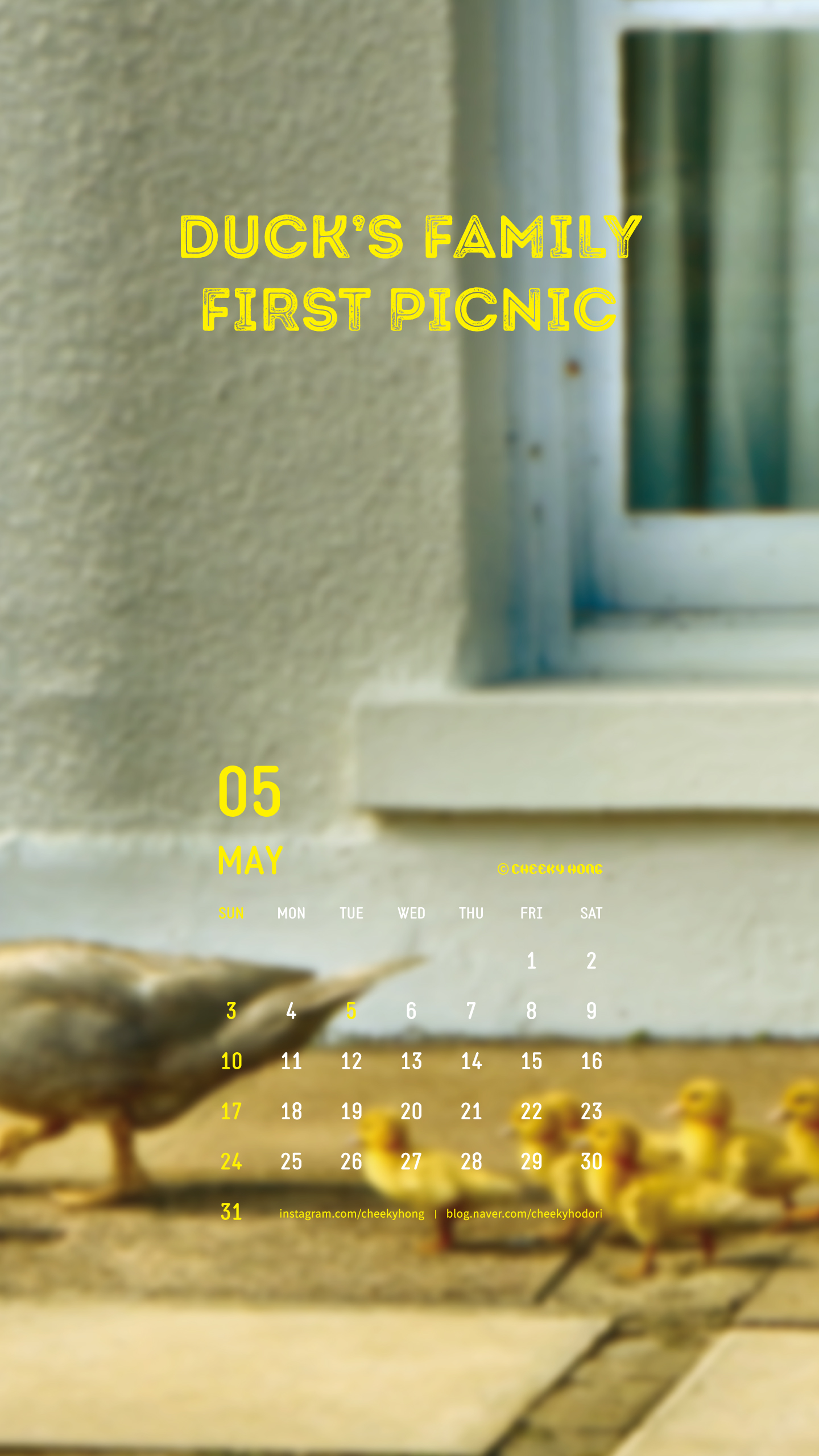5월 핸드폰 배경화면은 크게 두 가지 타입의 디자인으로 만들어 보았는데요. 첫 번째 보여드릴 디자인은 엄마따라 졸졸졸이라는 제목의 디자인이에요. 이미지를 보시면 왜 그렇게 지었는지 이해가 되시죠? 상단에는 오리 가족의 첫번째 피크닉이라는 타이틀이 영문으로 적혀있고요. 아래쪽에 5월 달력이 들어가 있는 달력형 타입입니다.