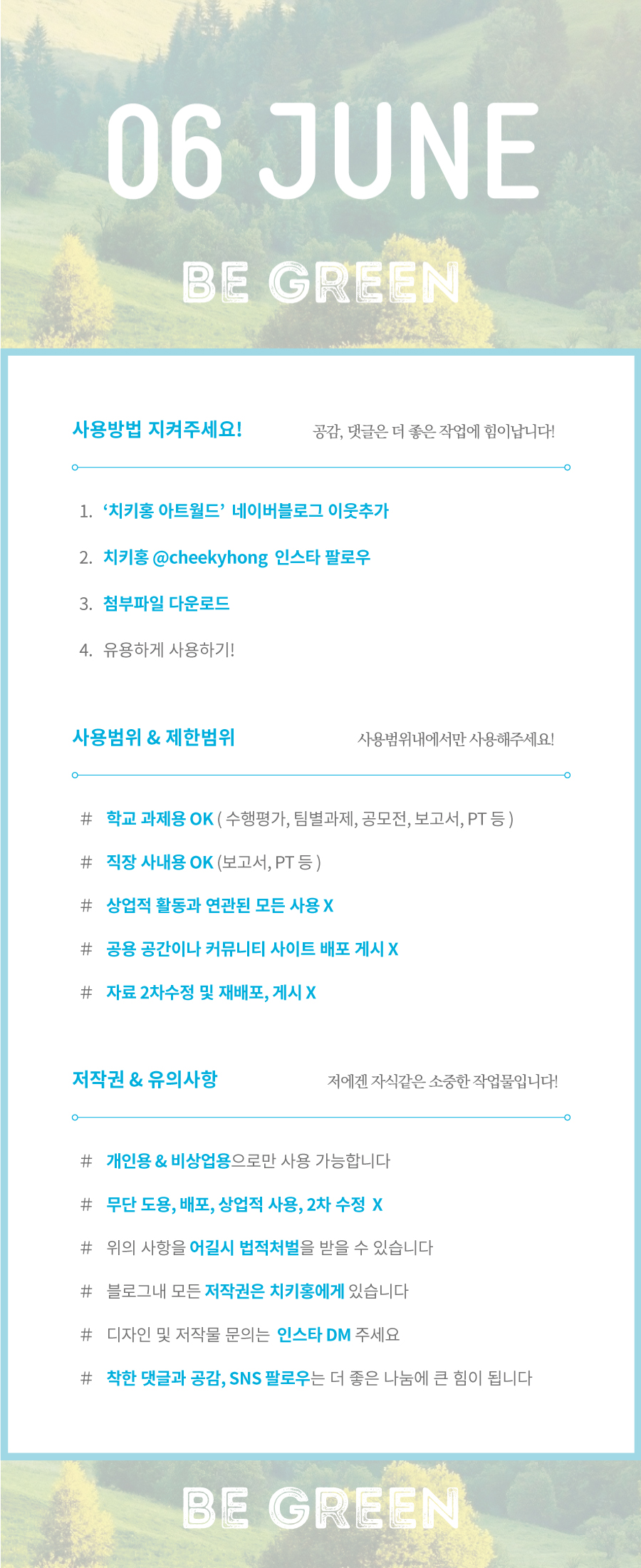 아래 06 JUNE 이미지에 자세한 사용방법이 있으니 읽어보시고 사용하면 좋을 것 같습니다. 참고로 디자인 나눔에 올려진 다양한 양식들은 비상업용 그리고 개인용 범위 내에서만 사용이 가능하니 저작권과 유의사항 꼭 지켜주세요!