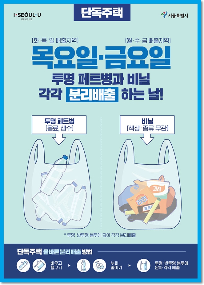 단독주택의 경우에는 비닐과 투명 페트병을 다른 재활용품과 구분되도록 투명 또는 반투명 봉투에 담아서 버리면 된다고 합니다. 분리배출 수거 요일은 지자체별로 차이가 있는데, 화요일 목요일 일요일에 쓰레기를 배출하는 지역은 목요일에, 월요일 수요일 금요일에 쓰레기를 배출하는 지역은 금요일에 분리배출이 수거된다고 합니다.