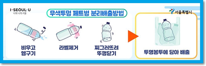 그중에서도 특히 비닐과 투명 페트병은 재활용률이 낮아 이번 서울시 분리배출제로 따로 분리하여 재활용률을 높이려는 의미가 담겨 있습니다.