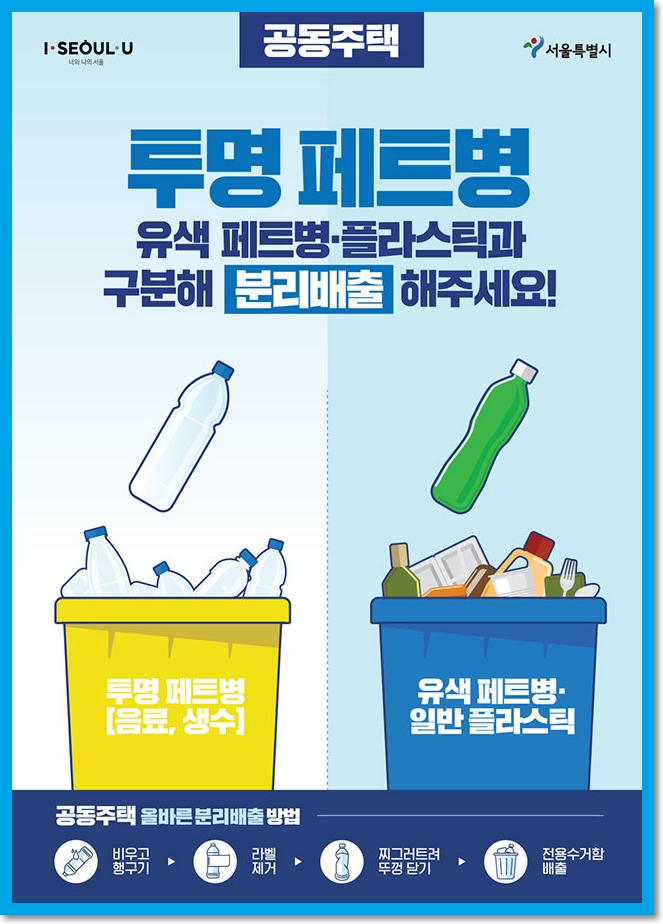 서울시는 5월부터 재활용품 배출 시 비닐과 음료 또는 생수용으로 사용되는 투명 페트병을 다른 재활용품과 별도 분리해서 버리는 '분리배출제' 시범운영을 강화한다고 합니다. 재활용품은 제대로 구분되어 분리수거되면 자원으로 충분히 재활용이 가능하지만 그렇지 못할 경우에는 쓰레기로 처리되어 활용이 되지 못하게 됩니다.