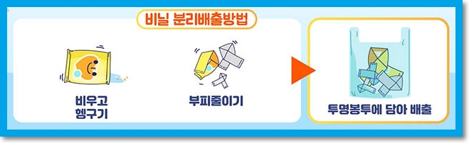 비닐은 색상, 크기, 종류에 상관없이 비우고 헹구기를 통해 잔여물이나 오염물질이 남아있지 않도록 한 다음 접거나 묶어서 부피를 줄인 후 투명봉투에 담아 배출하면 되겠습니다.