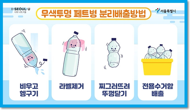 비우고 헹구기 > 라벨 제거 > 찌그러뜨려 뚜껑 닫기 > 전용수거함 또는 투명봉투에 담아 배출