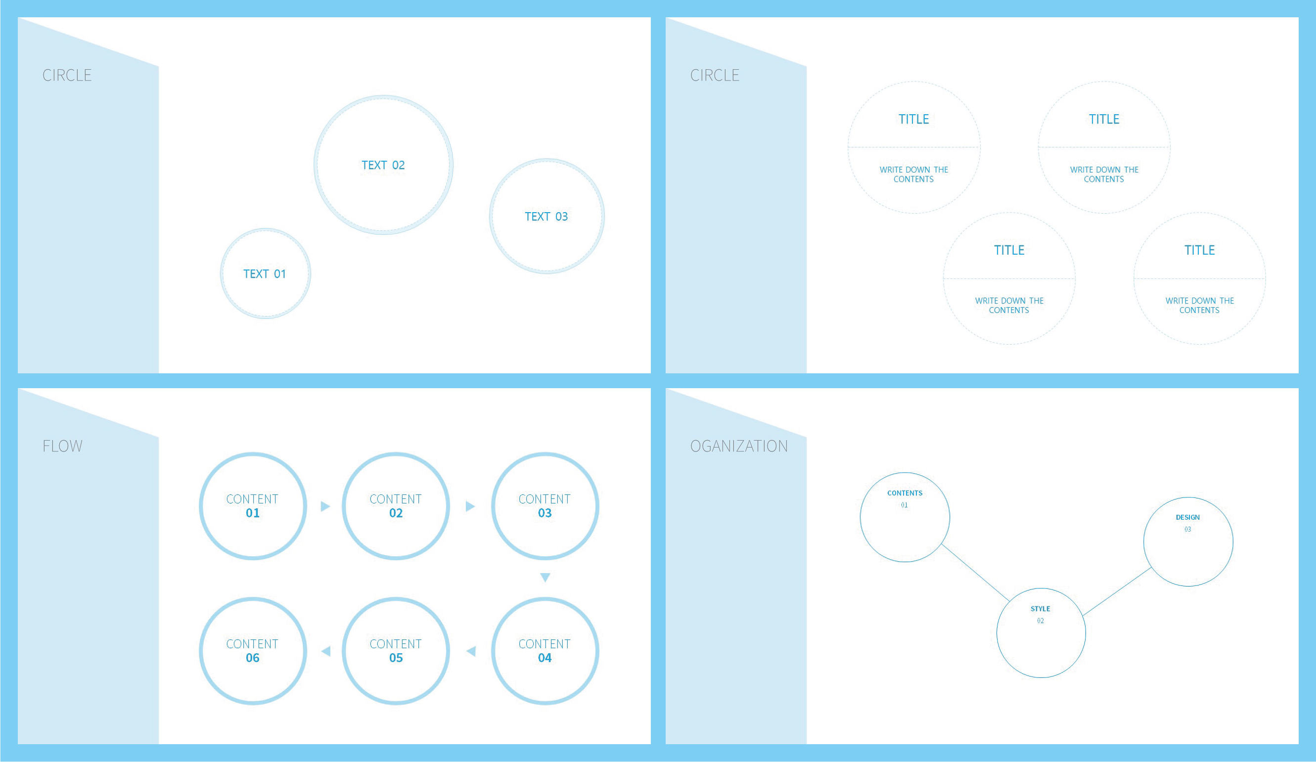이번에는 다양한 원 도형을 활용해서 만든 슬라이드입니다. 여러 구성요소를 부드럽고 은은한 원도형으로 다양하게 표현할 수 있어 PPT 디자인할때 많은 도움이 될 것 같습니다. 원을 활용한 다양한 구성과 흐름도 그리고 조직도까지 표현이 가능하니 활용도가 높을 거라 예상합니다.