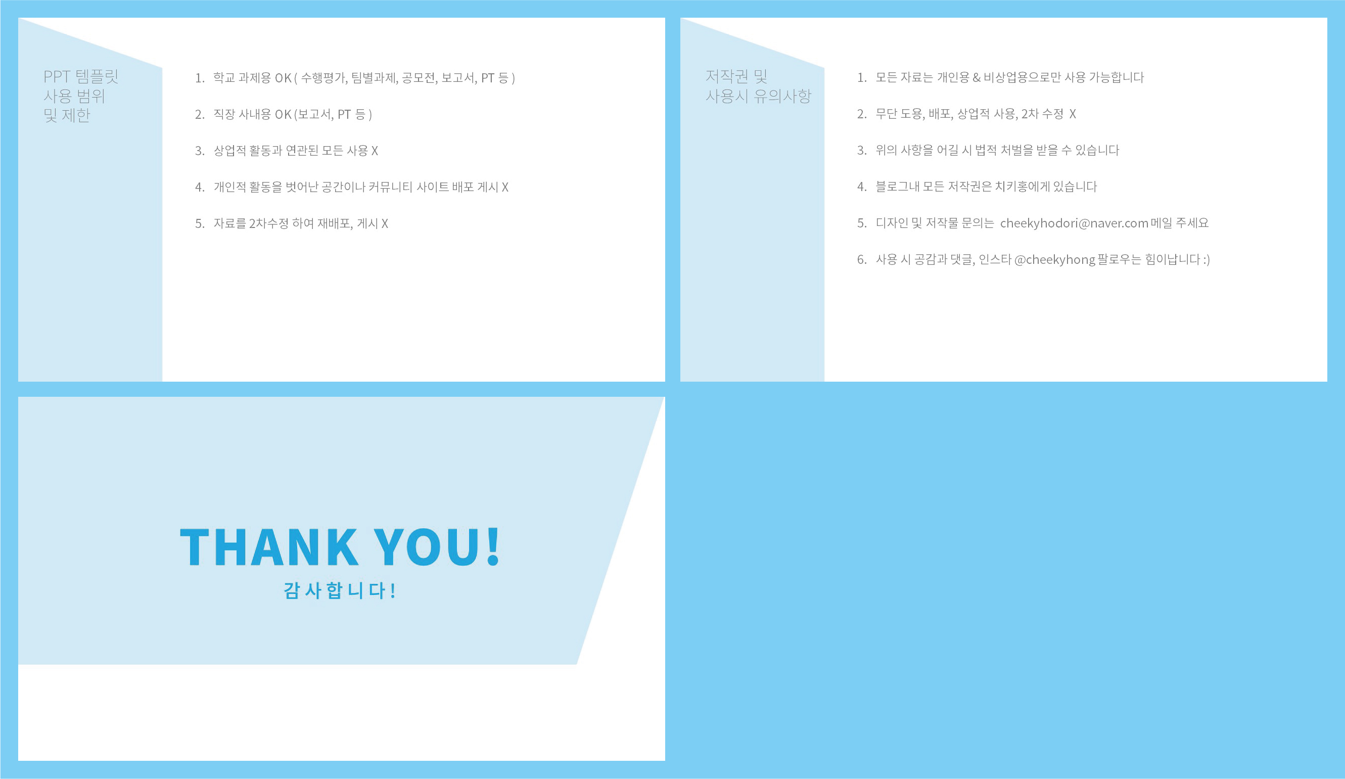 마지막으로는 심플한 무료 ppt 템플릿 사용범위와 저작권과 지켜야할 사항이 있으니 사용 시 꼭 참고해주면 감사하겠습니다. 그리고 마지막 인사는 첫 표지와 동일한 양식의 배경으로 된 '감사합니다' 표지로 마무리가 되어있습니다. 자신에게 맞는 내용으로 채워 바로 사용이 가능한 심플한 ppt 템플릿이었습니다.