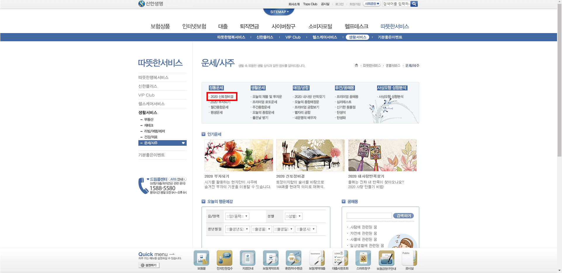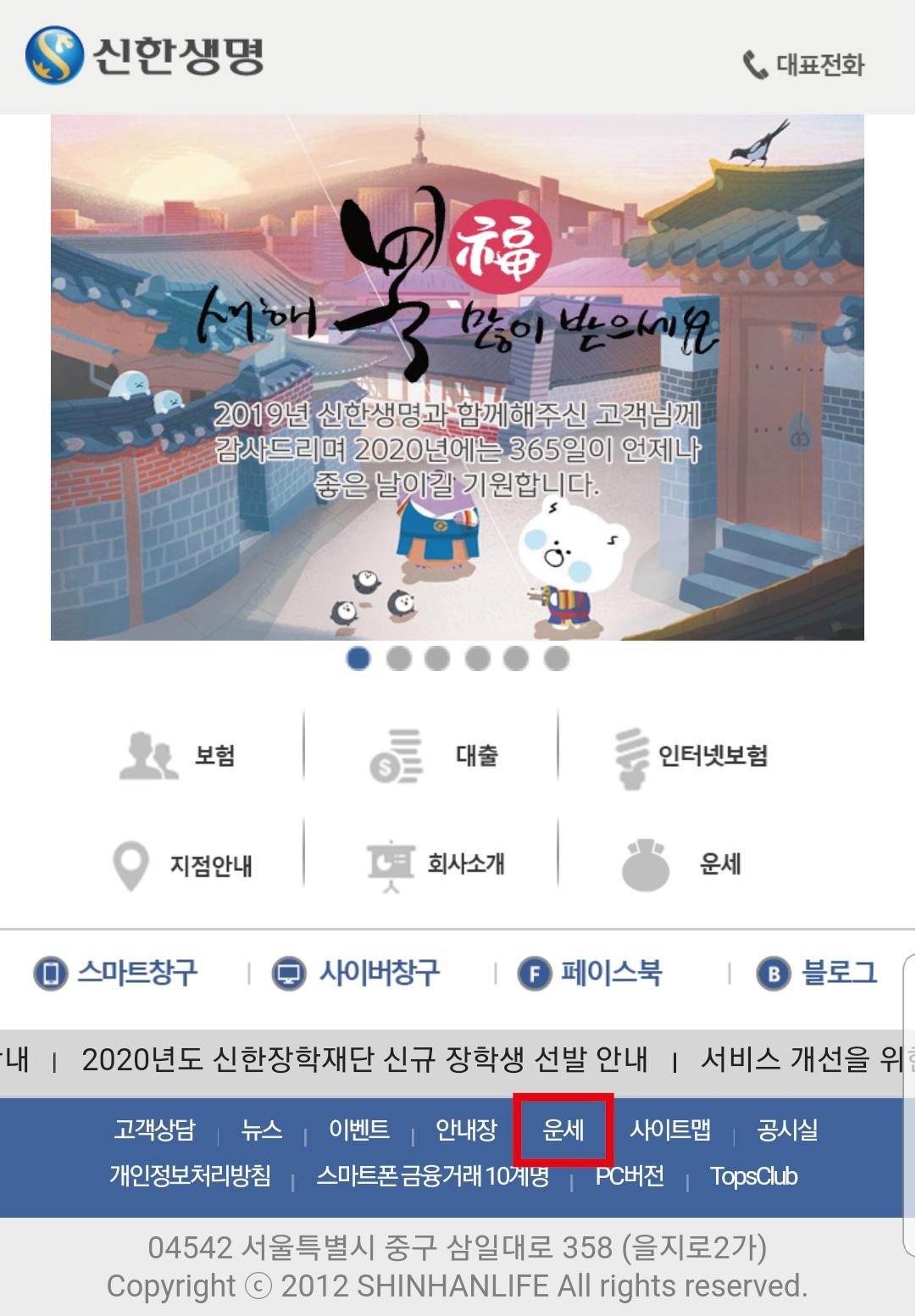 모바일에서는 신한생명 첫 페이지 아래쪽에 작은 글자로 운세를 눌러줍니다.