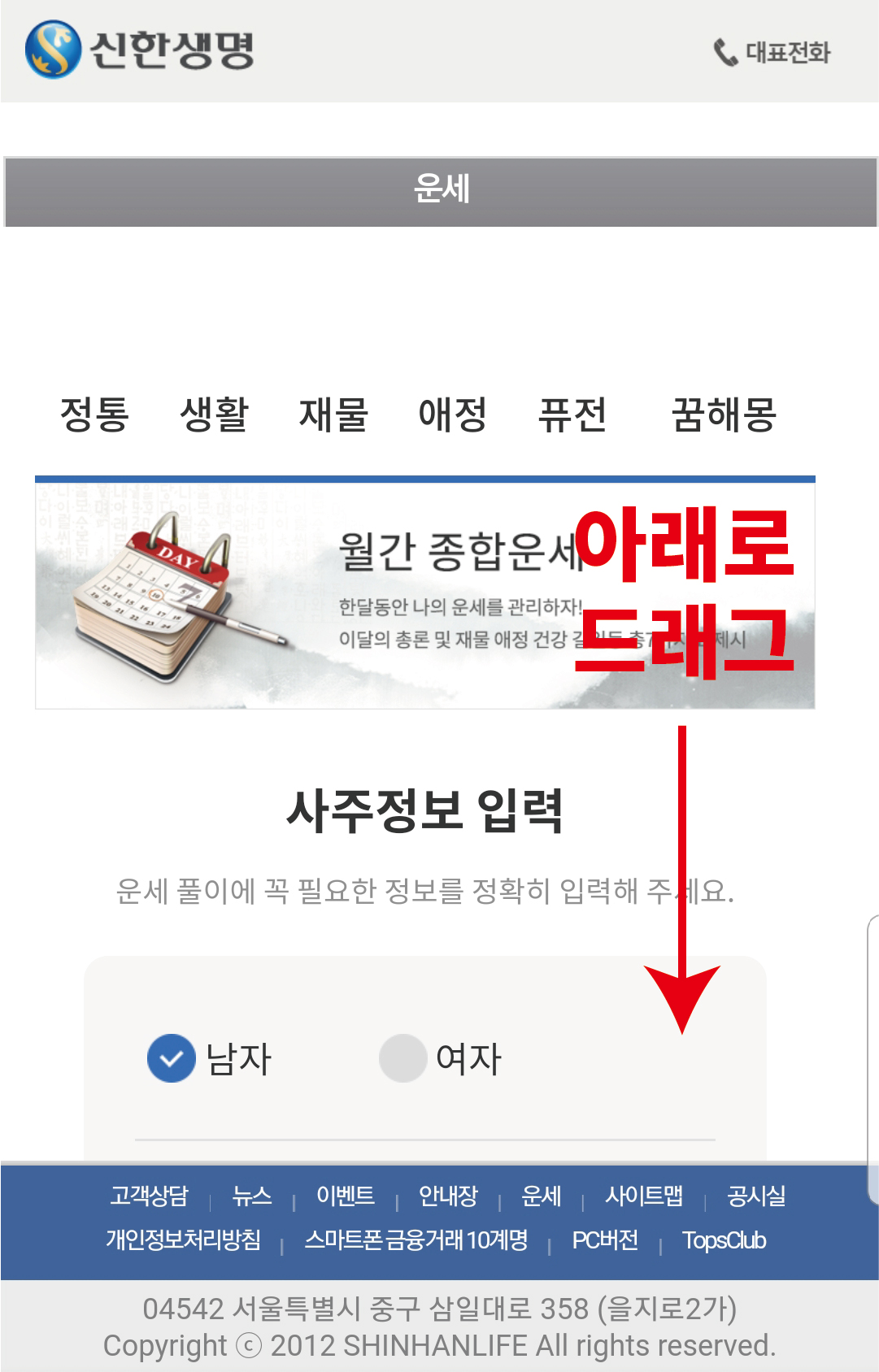 그리고 나오는 페이지는 월간 종합 운세라서 아래로 드래그해주세요.