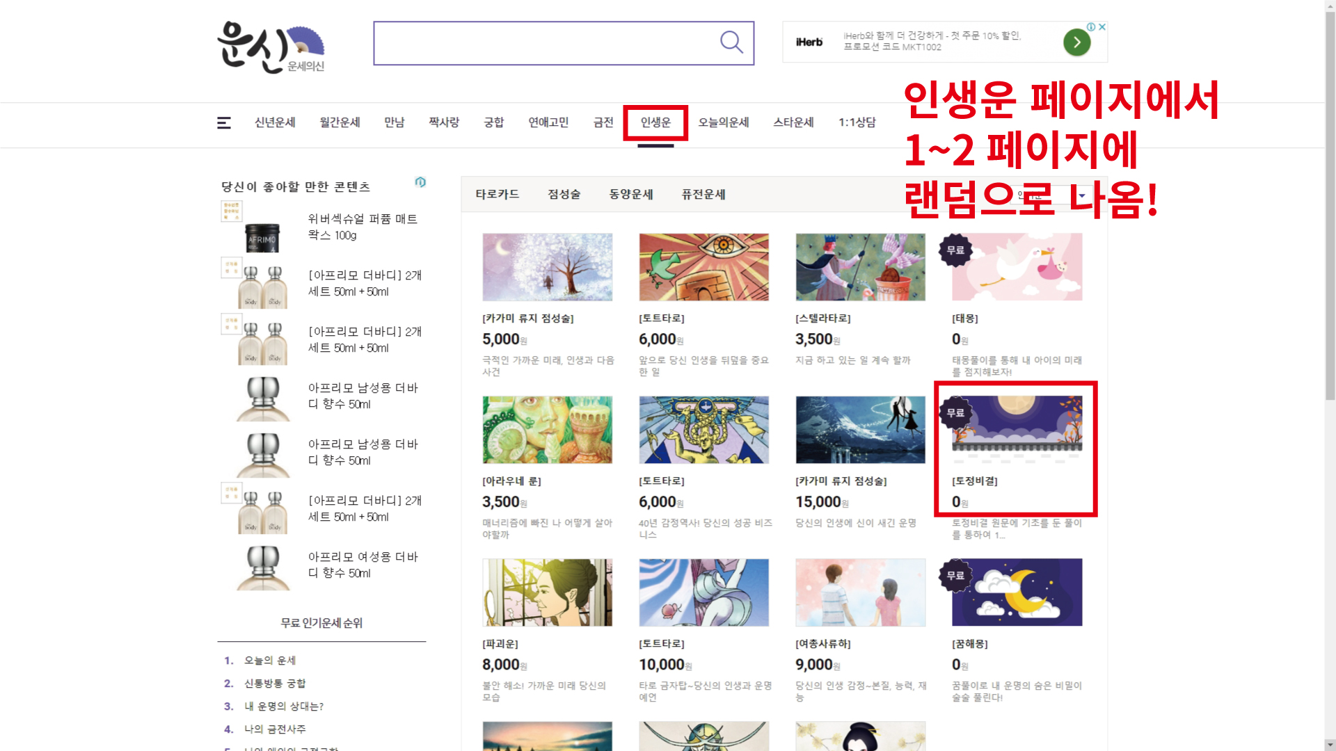 메뉴에서 인생운 누르면 1~2번째 페이지에 토정비결이 랜덤으로 나옵니다. 토정비결 0원으로 나와있는 부분을 누르면 회원가입없이 무료로 신년토정비결을 볼 수 있습니다.