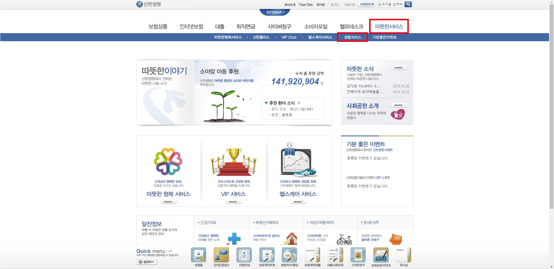 그리고 위 메뉴중에서 따뜻한 서비스 위에 마우스를 가져가면 나오는 서브메뉴 중에서 생활서비스를 눌러 들어갑니다.