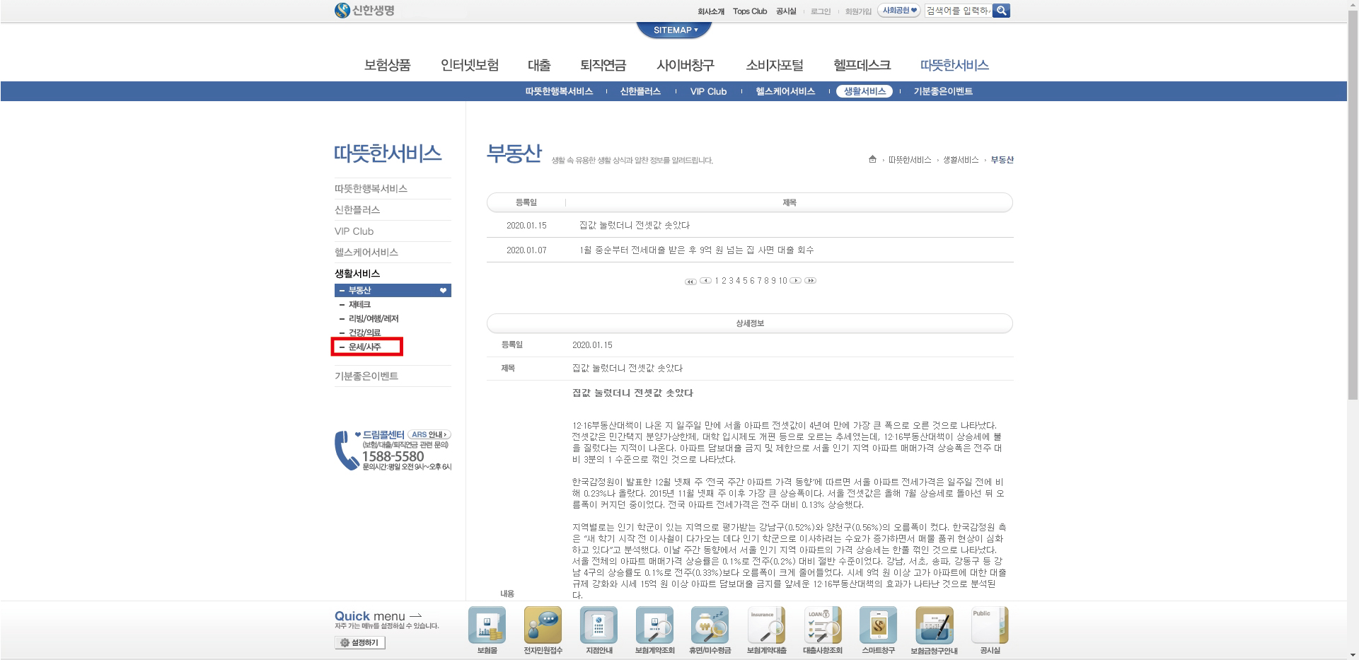 그럼 이렇게 부동산 페이지가 보일거에요. 왼쪽에 서브메뉴에서 운세/사주를 눌러주세요.