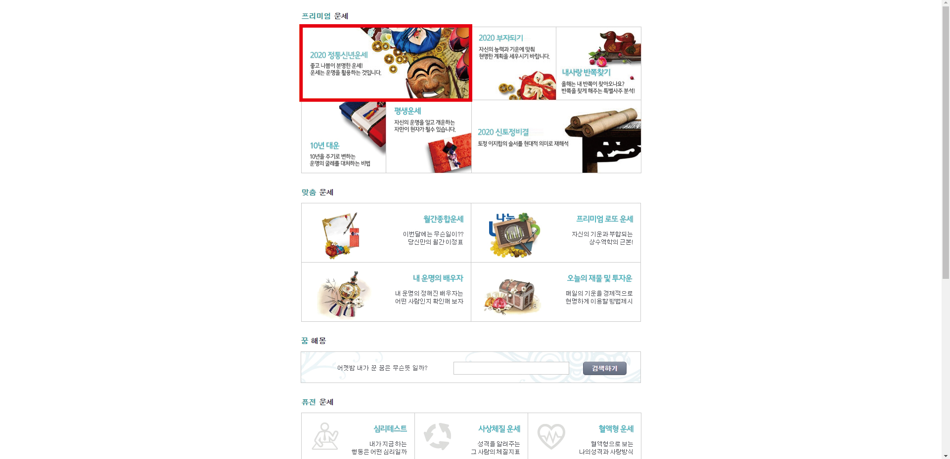 첫 페이지 왼쪽 상단에 보이는 2020 정통 신년운세로 들어가 줍니다.