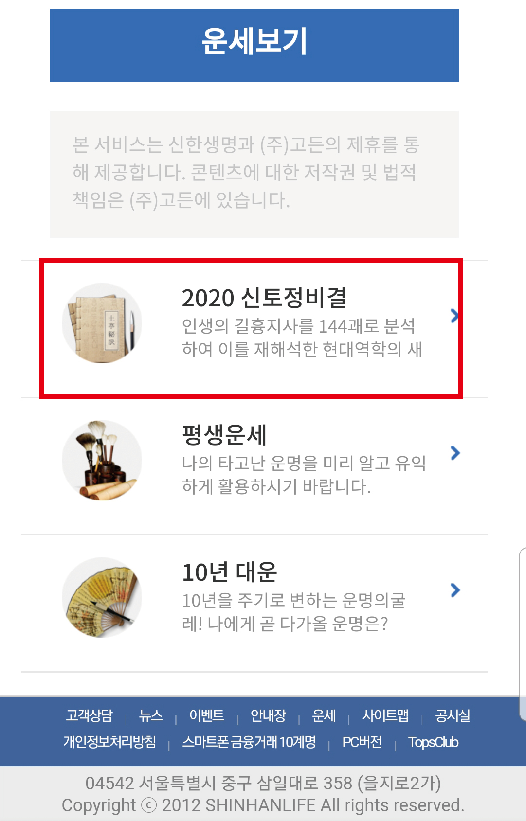 운세/사주 페이지에서 상단에 작은 글씨로 2020 신토정비결로 들어가면 됩니다.