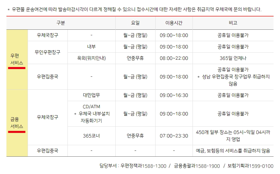 새 창이 뜨면서 이렇게 우체국 영업시간이 나옵니다. 크게 우체국은 우편 서비스와 금융 서비스 두 가지 서비가 시간이 다른데요. 우편 서비스는 평일 (월~금) 오전 9시부터 오후 6시까지 운영한다고 보면 되고요. 금융 서비스는 평일 (월~금) 오전 9시부터 오후 4시 반까지 운영한다고 설명되어 있네요. 우체국 내부 ATM기는 오후 6시까지 이용이 가능하고요. 365코너는 오전 7시부터 오후 11시 반까지니 참고하면 좋을 것 같습니다.