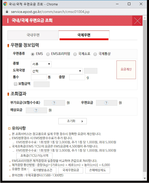 새 창을 보면 국내우편이 먼저 보이는데요. 보면 다양한 옵션들이 있네요. 여기서 자신이 보내고자 하는 옵션들을 선택하면 우편요금을 미리 알아볼 수가 있습니다.