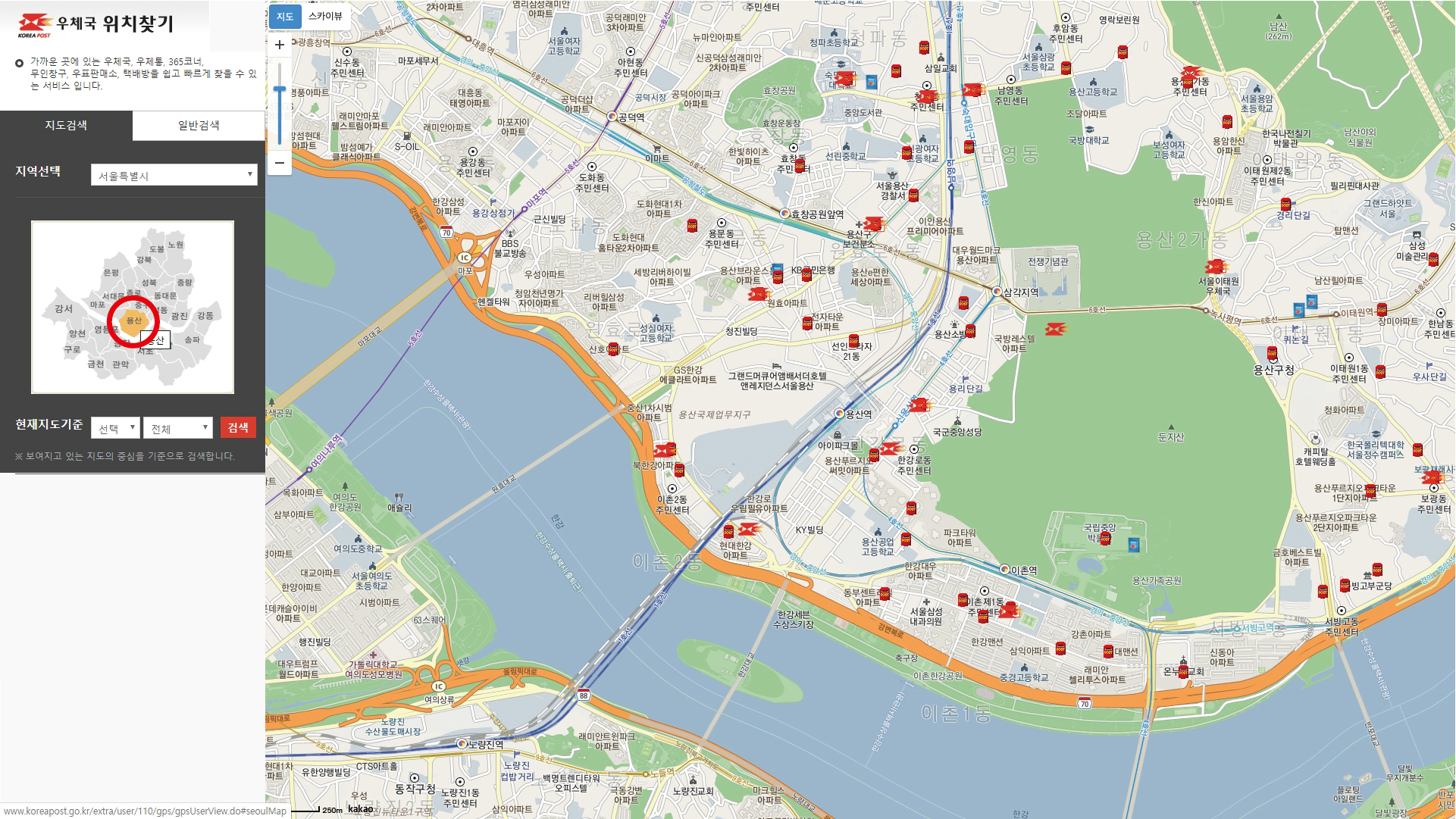 왼쪽에 서울시 지도 중에서 용산구를 눌러 주었더니 용산구 지역 우체국 지도를 볼 수가 있었습니다. 자신이 찾고자 하는 구를 누르면 손쉽게 다양한 지점 위치를 지도상에서 편리하게 볼 수 있는 것 같습니다.