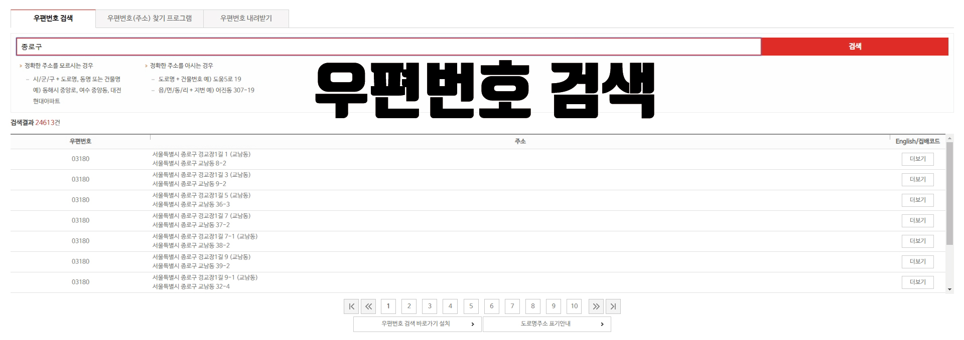 '종로구' 라고 입력해서 검색을 하니 이렇게 다양한 종로구 주소와 우편번호들이 나오는 걸 볼 수가 있습니다.