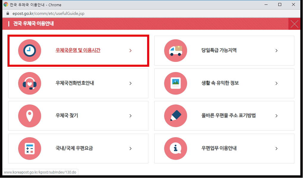 처음으로 우리가 제일 알고 싶은 우체국 운영 및 이용시간을 눌러줍니다.