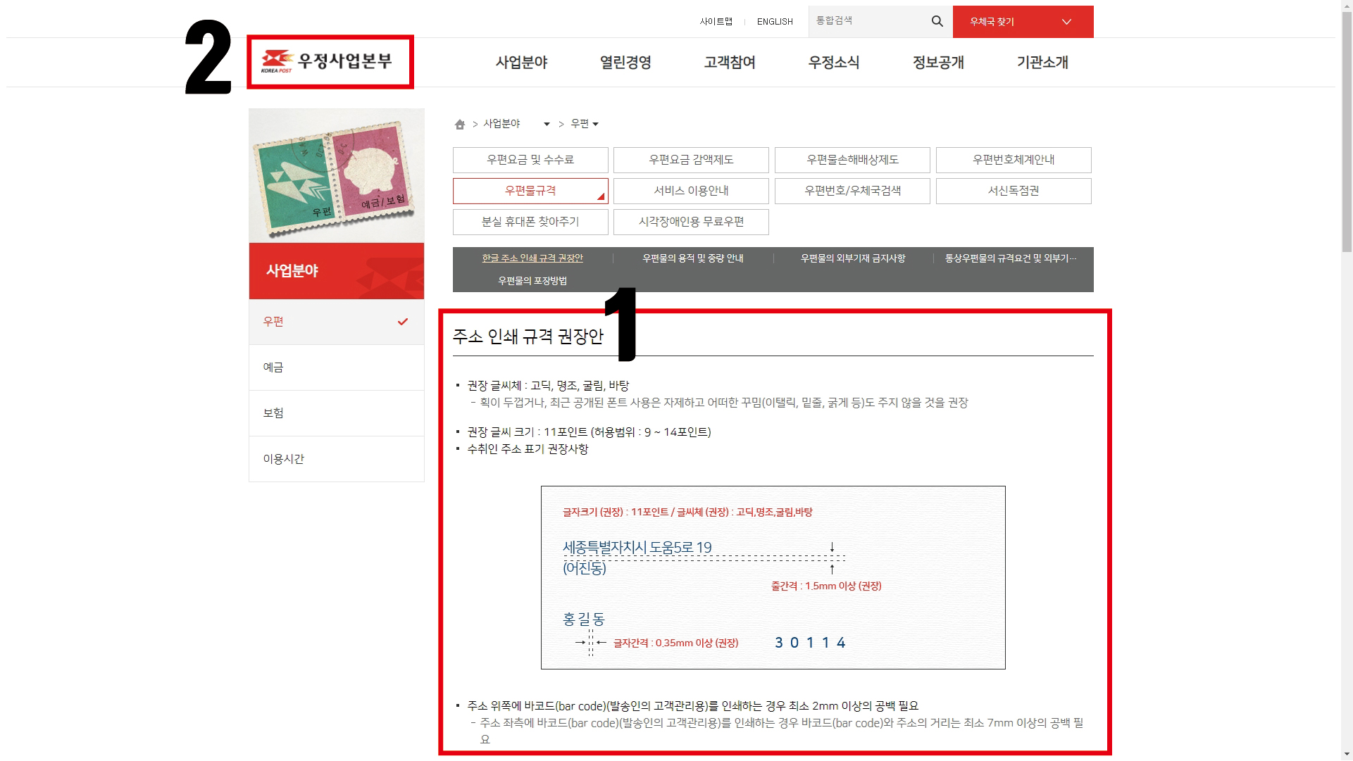 그러면 새 창에서 주소 인쇄 규격 권장안이 나오는데요. 너무 디테일해서 도저히 따라 할 수가 없을 것 같다는 생각이 들었습니다. 권장안이니까 지키도록하면 좋겠지만... 완벽히 지키기는 어려울 것 같다는 생각이 드네요. 권장안은 재미있게 한번 둘러보시면 좋을 것 같고요. 새 창에 왼쪽 상단에 있는 '우정사업본부' 로고를 눌러서 우정사업본부 사이트를 살펴보도록 하겠습니다.