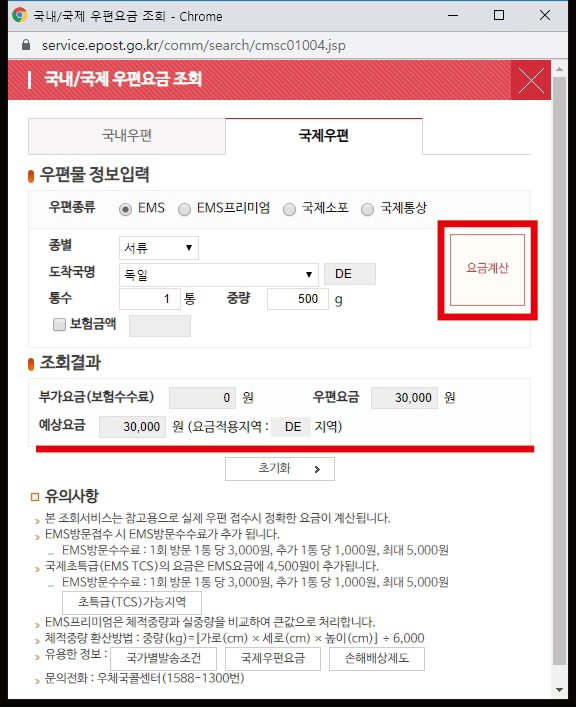 제가 임의로 서류 500g 한 통을 독일로 보낸다고 입력을 해보았는데요. 아래에 보면 예상요금에 3만 원이 나온다는 걸 알 수가 있었습니다. 국제우편하면 무조건 비싸다는 선입견이 생겨서 더 부담스럽게 느껴지는 부분이 있는데 이렇게 미리 배송료 견적을 알 수 있어서 편리하게 이용이 가능할 것 같습니다.