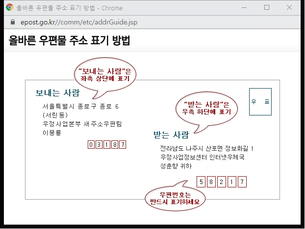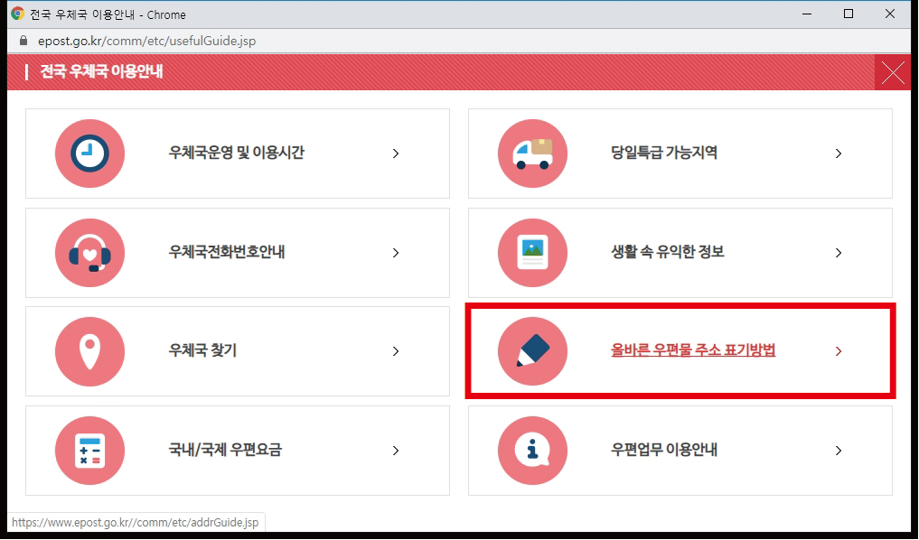 이건 궁금해서 눌러보았는데 이렇게 귀여운 작은 창이 하나가 뜨더라고요. 보니까 어린아이들도 알 것 같은 우편물 주소표기 방법이 자세히 있어서 굳이 메뉴로 만들 필요까지 있었나 의문이 들더라고요. 어린이들 교육용으로는 좋을 것 같은데 그런 건 학교에서도 배우는 것 같은데 말입니다.