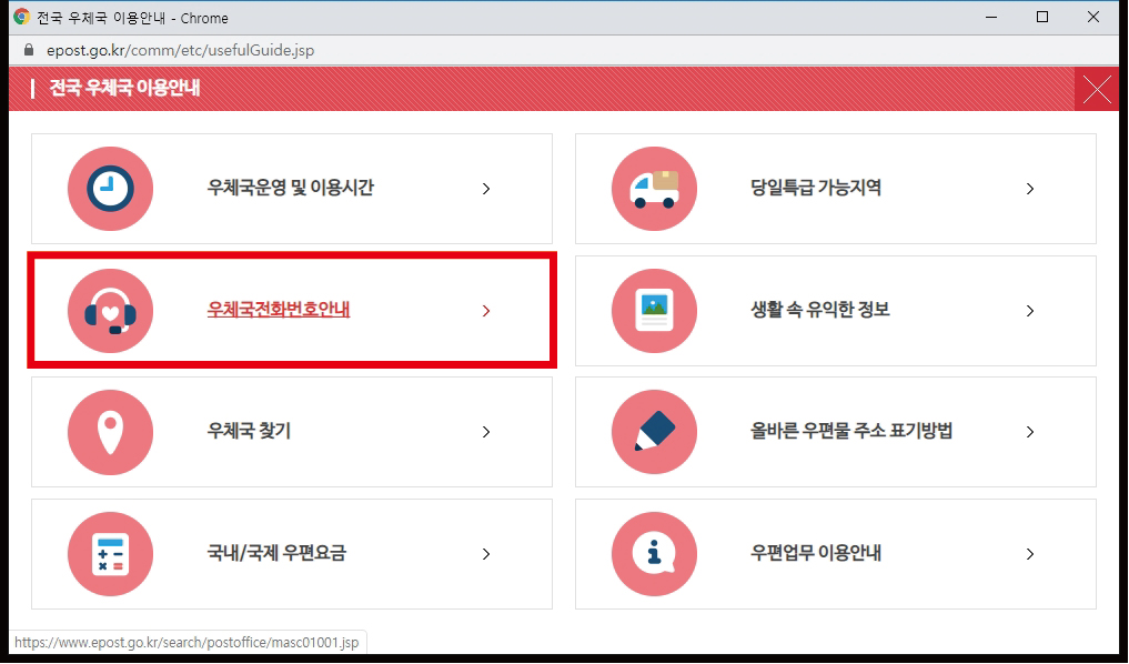 맨 아래쪽에서 두 번째에 있는 '전국 우체국 이용안내 서비스'를 클릭해주세요!