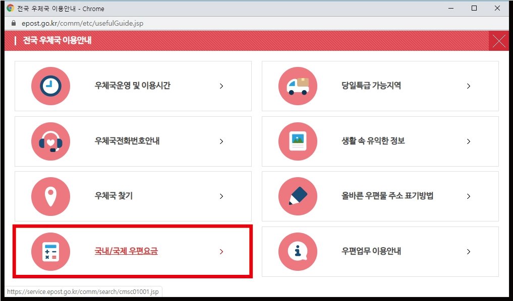 인터넷상으로도 우편요금을 손쉽게 알아볼 수 있어서 소개해드리려고 합니다. 국내뿐 아니라 국제 우편요금도 알 수 있어서 부담 없이 가격을 미리 예상해볼 수 있을 것 같아요. 국내/국제 우편요금을 눌러 새 창을 띄워줍니다.