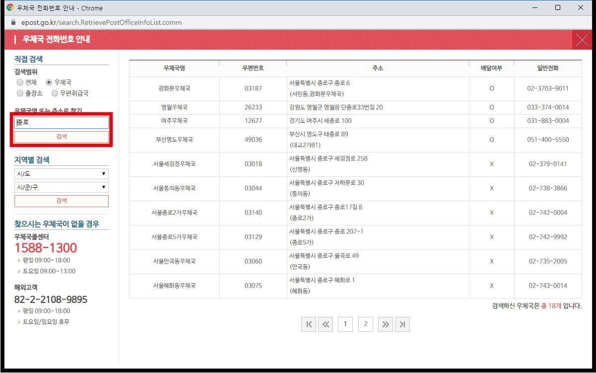 종로라고 입력하고 검색을 누르면 이렇게 종로 지역의 다양한 우체국 주소와 전화번호가 나오네요. 자신이 찾고자 하는 지점 우체국 전화번호는 이렇게 검색하면 편할 것 같습니다.