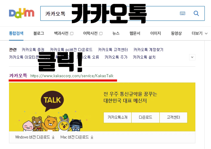 자신이 좋아하는 포털에서 '카카오톡'을 입력하면 카카오톡 사이트가 나오는데요. 사이트로 들어가 줍니다. 저는 다음 포털에서 검색을 해주었는데요. 다음과 카카오톡이 한 계열사라그런지 카카오톡을 검색하자마자 아래에 이렇게 카카오프렌즈 배너가 같이 보이더라고요. 아래 다운로드를 눌러도 바로 다운로드가 되지 않고 사이트로 연결되니 사이트를 눌러 이동하는 걸 추천합니다. 아래 '윈도우 버전 다운로드'는 바로 파일이 다운로드되니 급하신 분들은 그걸 눌러도 됩니다.
