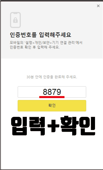 이제 인증번호를 입력해 달라는 칸이 나옵니다. 30분 정도의 유효시간 안에 완료를 해야 된다는 안내문구도 보이네요. 그걸 읽는 사이에 여러분의 카톡에 메시지가 와있을 겁니다. 메시지를 확인하러 가볼까요?