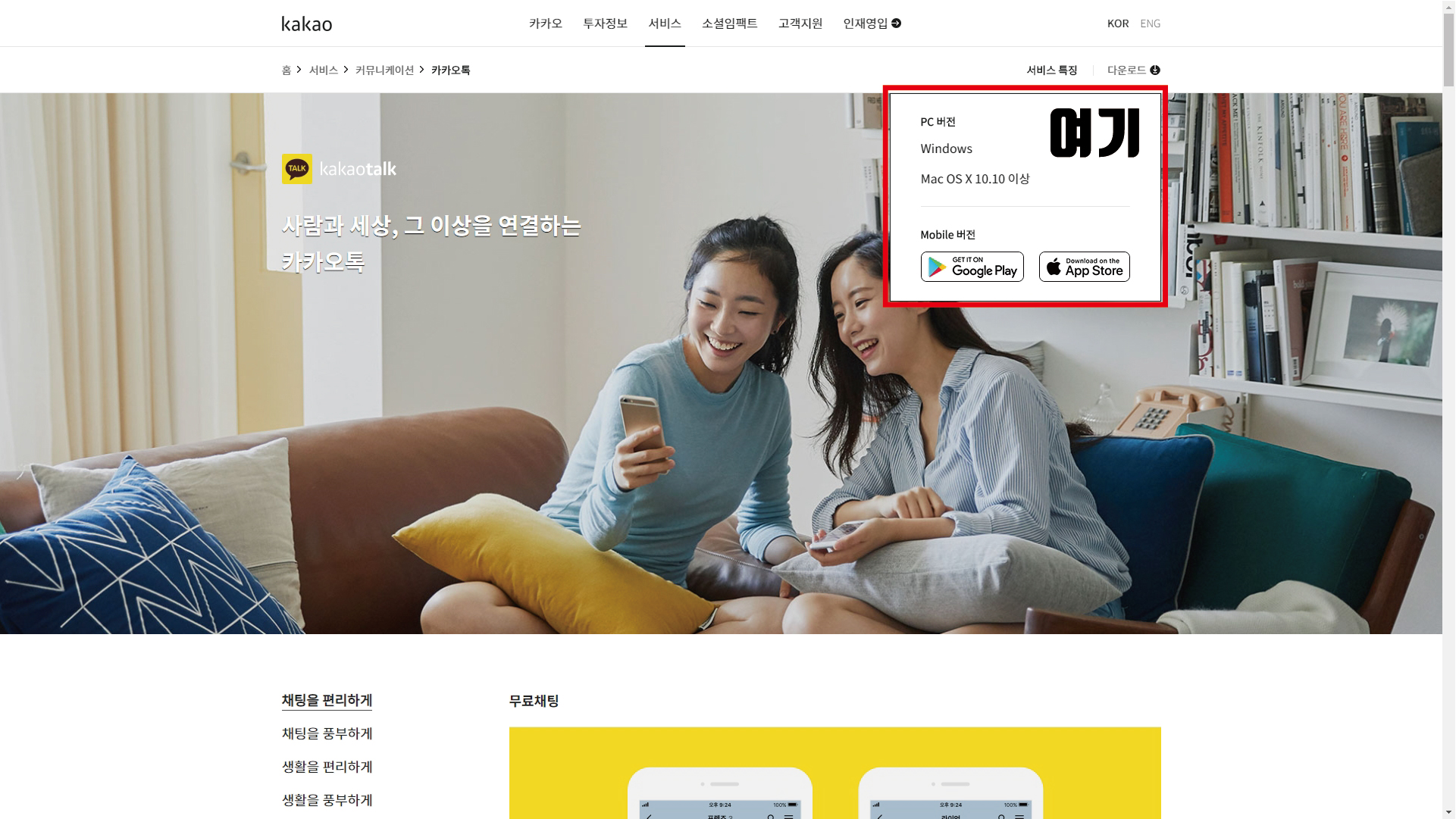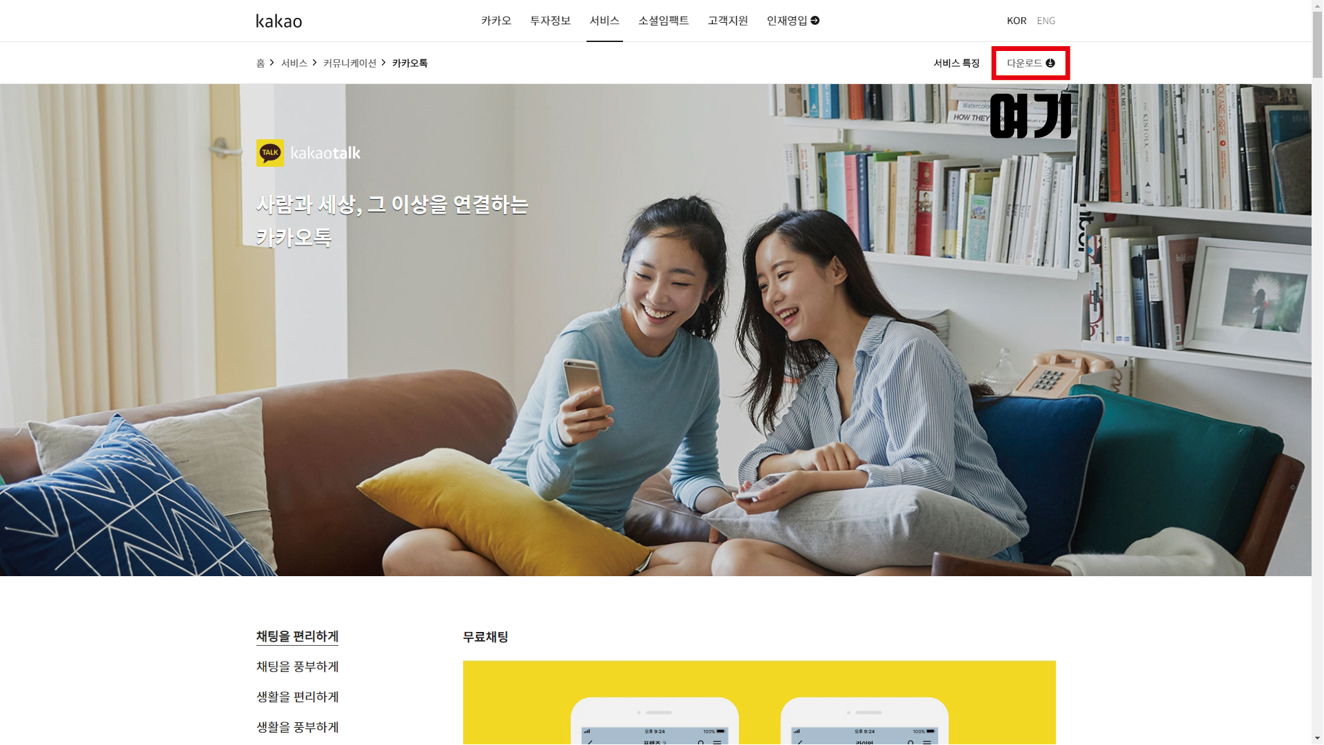 사이트로 들어오면 이렇게 아름다운 두 여자 사람분들이 하나의 핸드폰 화면을 응시하고 있는 모습을 볼 수가 있습니다. 아마도 핸드폰 내에는 카카오톡 대화 내용을 보고 있을 거라 예상됩니다. 아니면 혹시 라인을 보며 비웃고 있는 건 아니겠죠? ㅋㅋ 한국에서는 카카오톡이 대세지만 동남아 쪽에선 라인이 대세인데... 저만의 재미있는 상상이었습니다. 사이트에서 메뉴 부분 오른쪽 '다운로드'에 마우스를 가져가 봅니다.