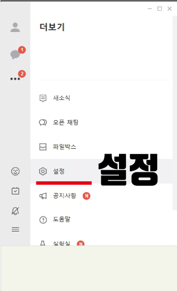 더보기 페이지가 나왔다면 다양한 메뉴들을 볼 수가 있는데요. 새소식, 오픈채팅, 파일박스 다음에 있는 네 번째에 있는 설정을 눌러 설정 팝업창이 나오도록 해줍니다.
