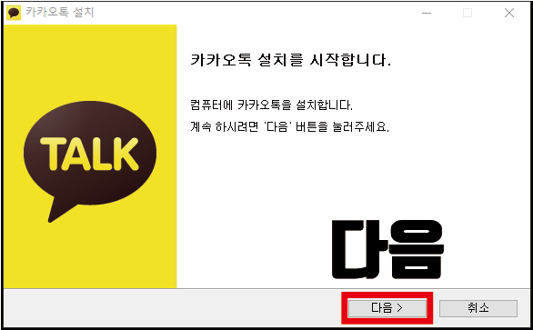 파일을 실행시키면 카카오톡 설치 팝업창이 뜹니다. '카카오톡 설치를 시작합니다.'라는 문구가 반갑게 보이는데요. 다음을 눌러 설치를 진행합니다.