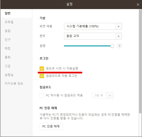 이렇게 설정 팝업창에서 다양한 설정을 조정할 수 있는데요. 만약 매일 컴퓨터를 시작하면서 카카오톡 PC버전을 사용할 분들은 상관이 없지만 저처럼 필요시에만 카카오톡을 사용할 분들은 '윈도우 시작 시 자동실행'을 찾아 앞에 네모 박스에 체크를 해제해주어 컴퓨터 시작 시 카카오톡 PC버전이 자동으로 실행되지 않게 해줍니다. 불필요한 프로그램이 매번 실행되면 컴퓨터도 무거워지고 매번 끄기도 귀찮은 분들을 위해 추천드립니다.