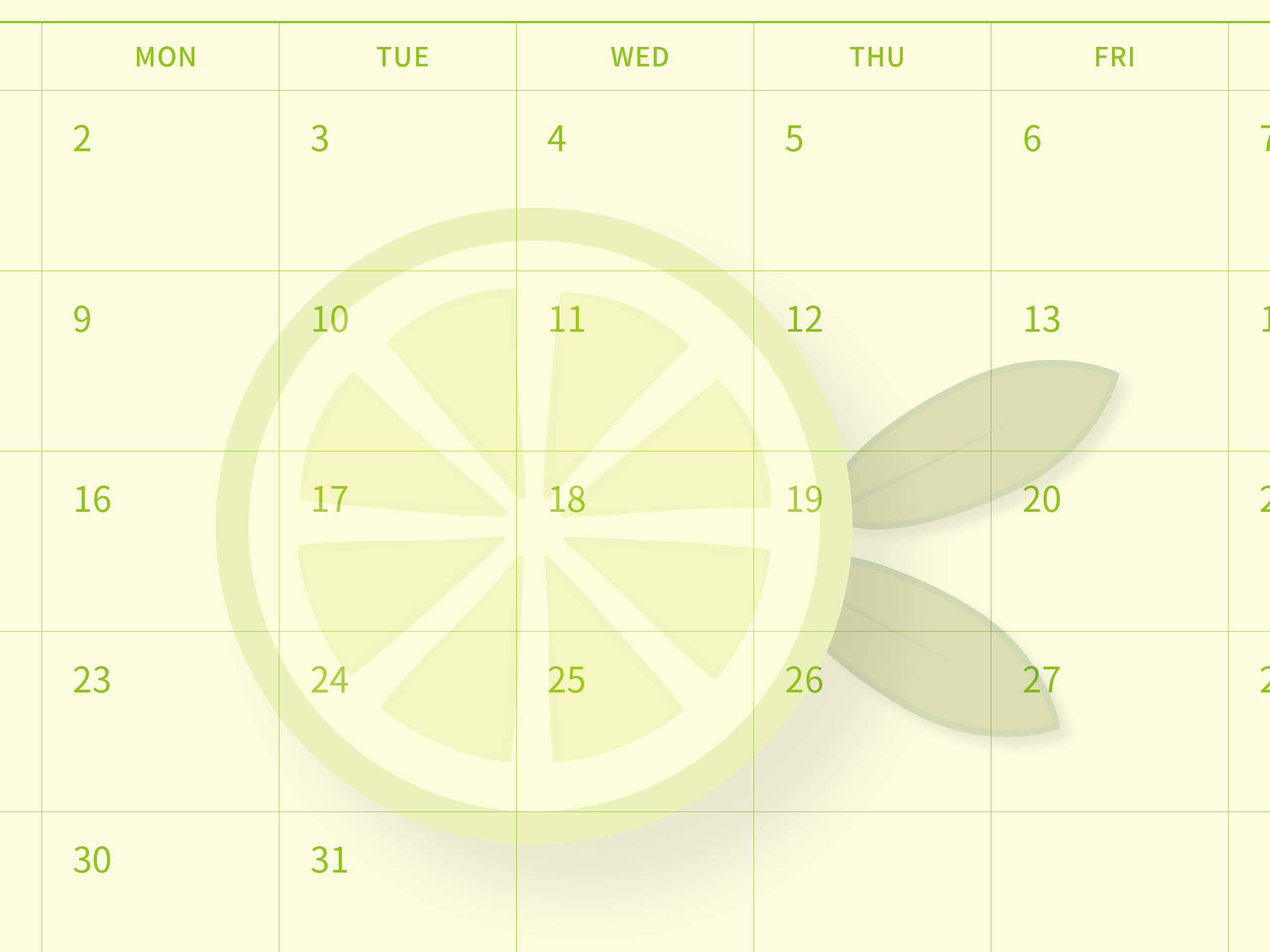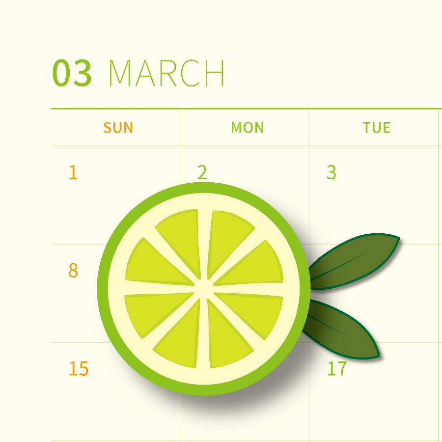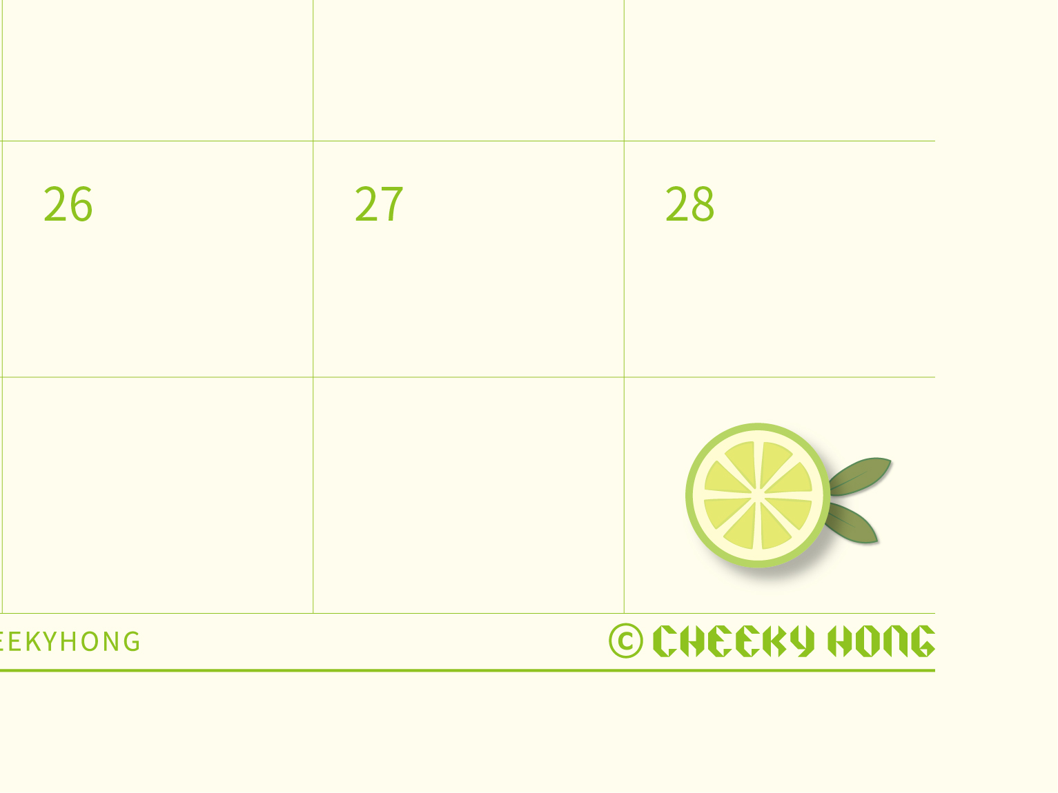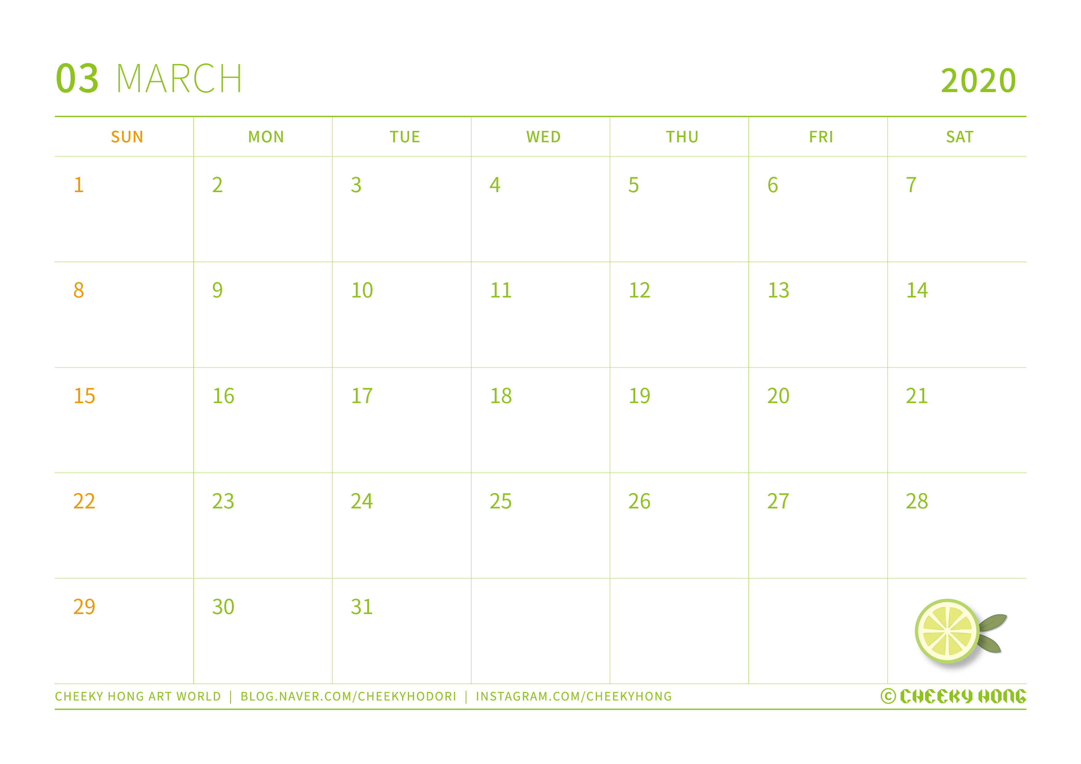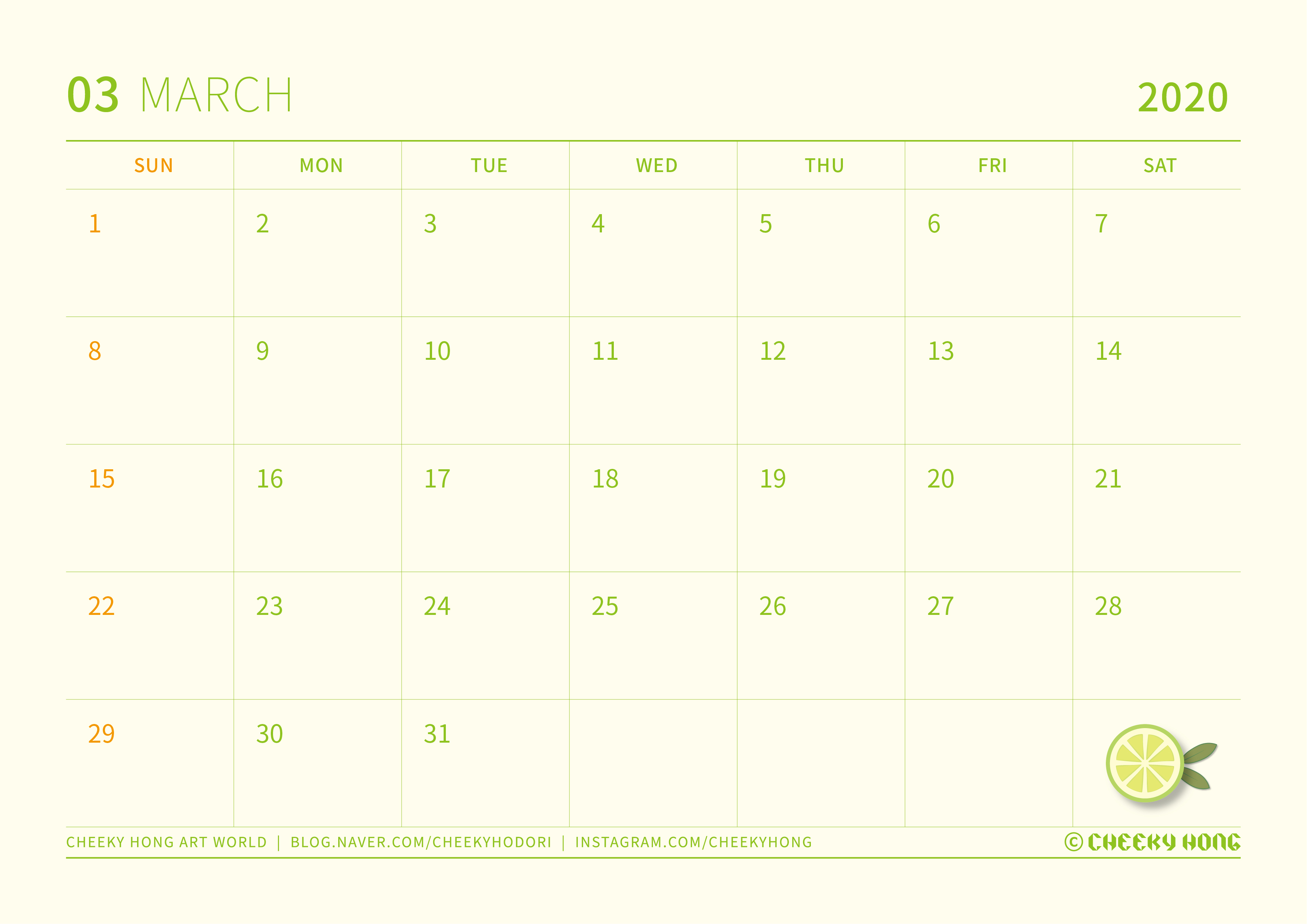 먼슬리 플래너 첫 번째 디자인은 작은 풋풋라임이 마지막날에 딱 박혀있는 베이비 풋풋라임인데요. 날짜가 적혀있지 않은 마지막날이지만 라임때문에 기다려지는 느낌이 들지 않나요. 3월에는 딱히 쉬는날이 주말말고는 없더라고요. 어쩌면 지금 코로나19가 잠잠해질때까지 쉬는날이 없는게 확산에 도움이 될 수 도 있다는 생각이 들기는 했지만, 그래도 추가휴일이 없어서 벌써부터 힘들것 같은 느낌이 들더라고요. 그래도 3월이니 으쌰으쌰 햄내서 시작해봐야겠죠.