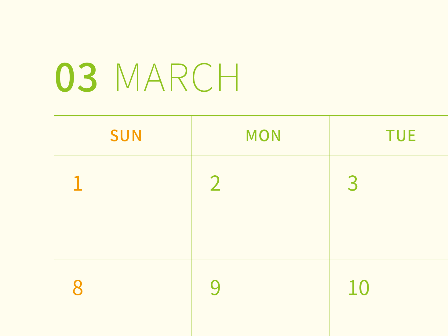 3월 먼슬리 플래너다보니 라임과 같은 연두 초록색을 사용해서 3월과 영문 MARCH 그리고 날짜와 요일에 봄 느낌을 넣어주었어요. 상단에는 달과 올해 연도 2020년이 있어 따끈따끈한 신상 3월 먼슬리 플래너라는 걸 알 수 있을 거예요. 그리고 주말은 연두 초록색과 잘 어울리는 오렌지 컬러로 포인트가 되도록 SUN과 일요일 날짜 색을 입혀주었습니다.